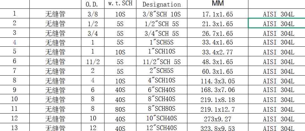 求购304L无缝管美标尺寸